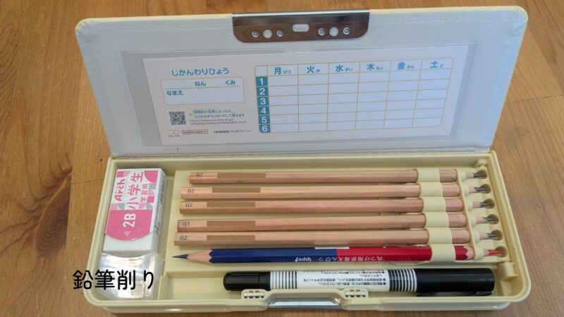 筆箱は「鉛筆5本、赤青鉛筆1本、油性ネームペン、消しゴム、まっすぐな定規(折り畳みNG)1本」が入るものと指定がありました。