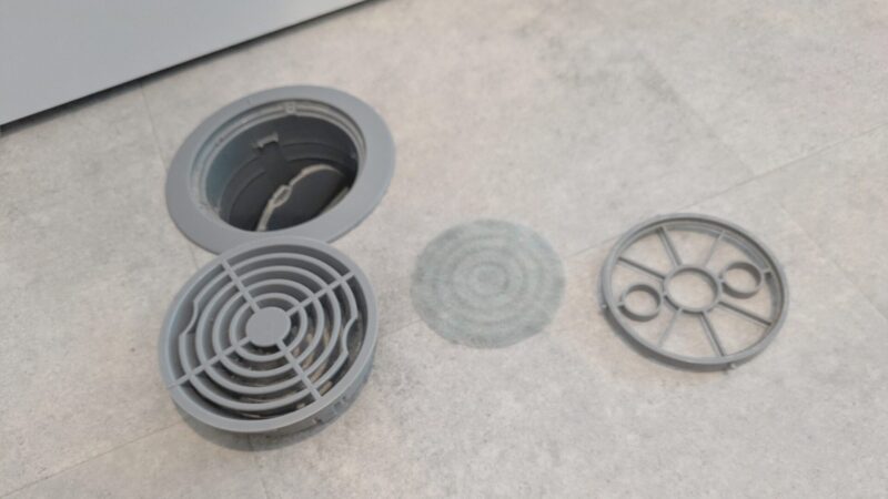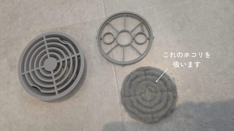 こちらが、わがやで一番お手入れし甲斐のある洗面所の屋内フィルター!前回のお手入れから27日経ってました。パコッと外れるので、フィルターのホコリを掃除機で吸います。